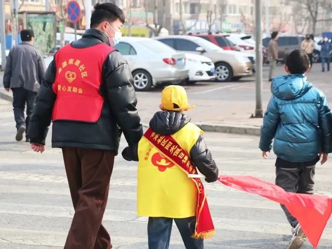 志愿者们来到金源医院前,协助指挥交通,劝导行人依照交通灯指示通行,护送老人穿过马路,维护人行道安全有序。