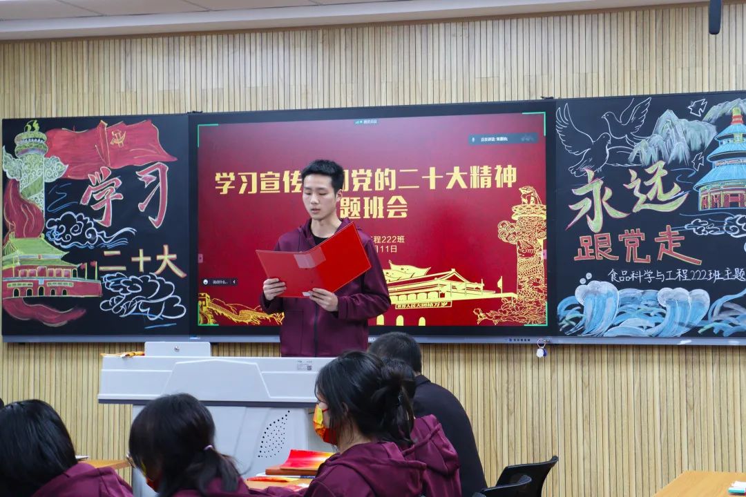 为深入学习宣传贯彻党的二十大精神,把生命科学学院学子的思想统一到党的二十大精神上来,引导学生将学习贯彻党的二十大精神转化为立志为中华民族伟大复兴而读书的实际行动,增强“四个意识”、坚定“四个自信”、做到“两个维护”。结合“铸牢中华民族共同体意识教育月”活动安排,食品科学与工程222班召开学习宣传贯彻党的二十大精神主题示范班会。班导师曹红光、辅导员缪立欣出席班会。