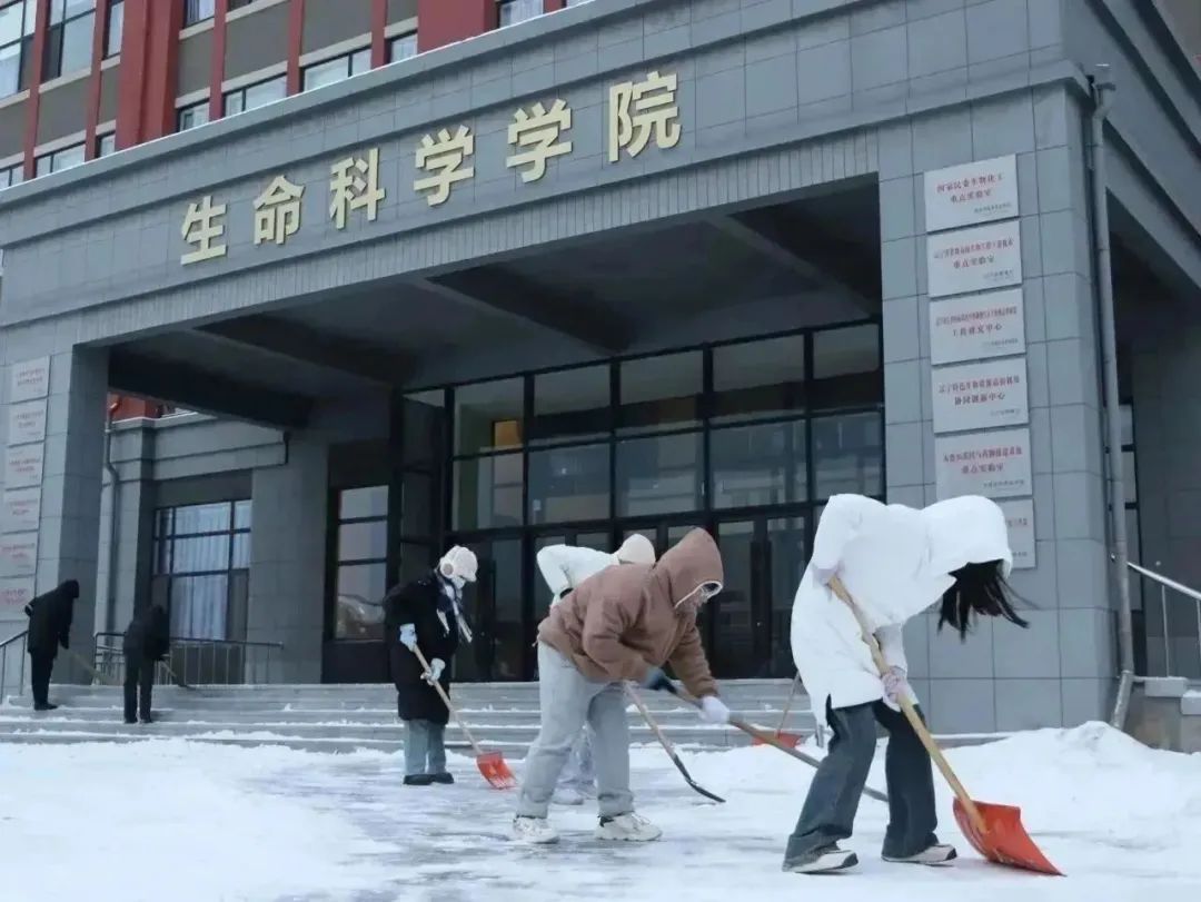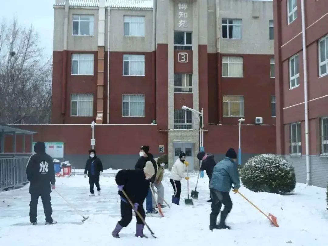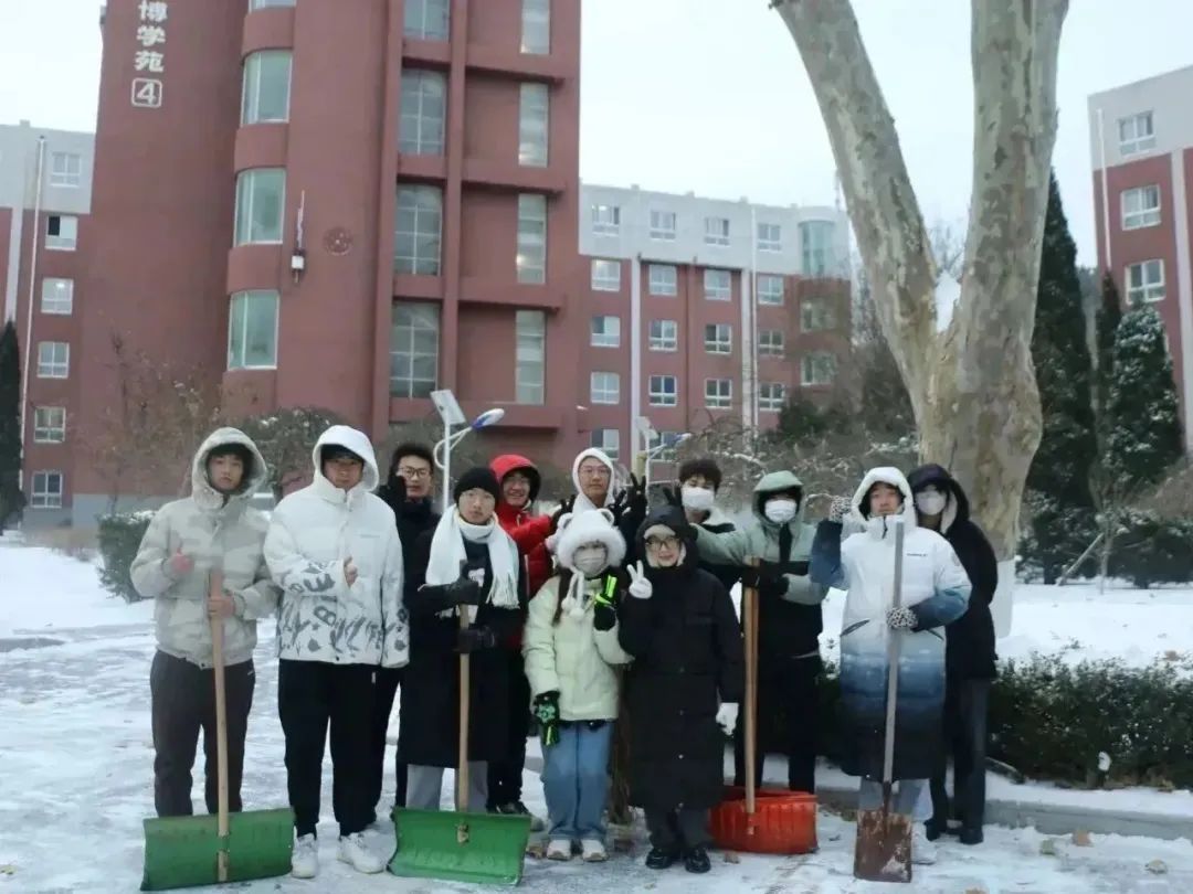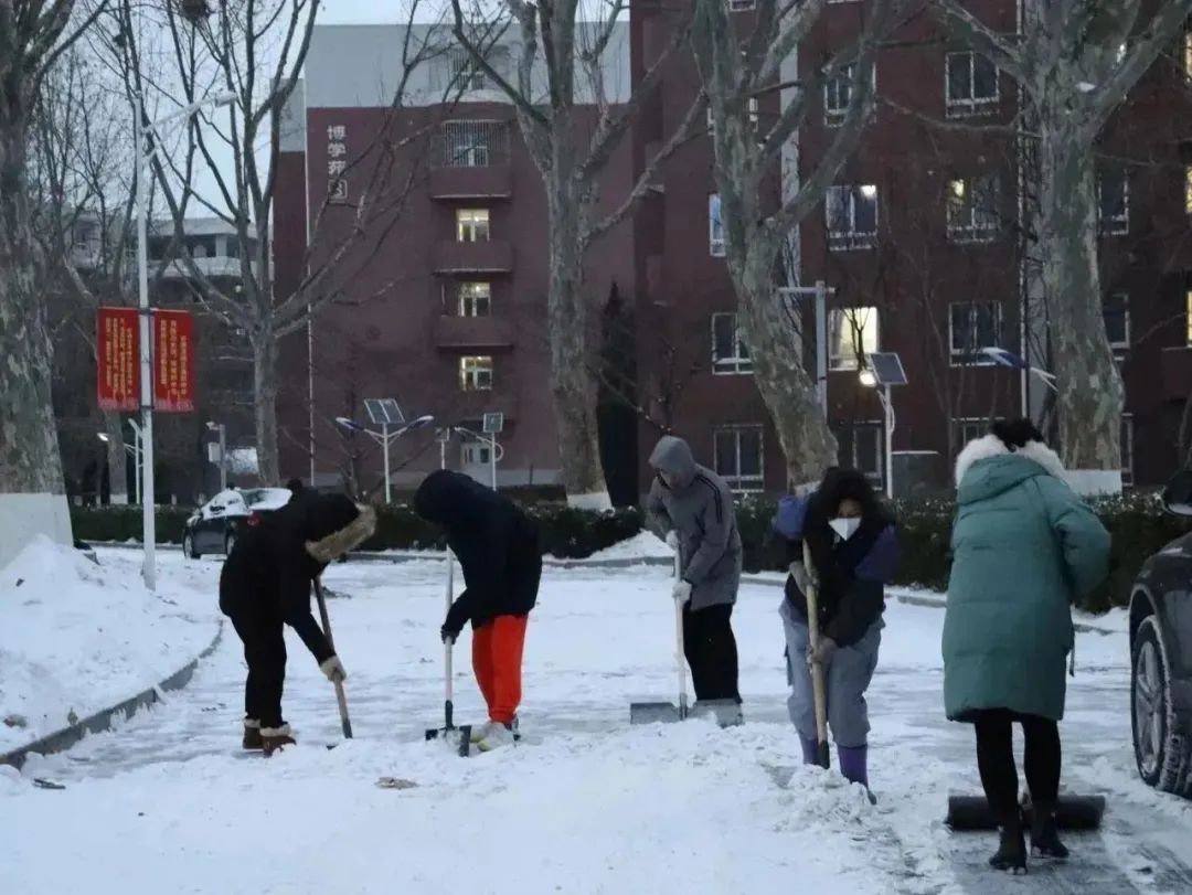生科ers齐心协力,干劲儿十足,推、铲、扬各种方式齐上阵,奋力清除冰雪。尽管北风凛冽,他们的热情却丝毫没有被寒冷所影响,彼此相互鼓励和交流。他们的身影在寒风中显得格外坚韧,为这个冰冷的冬日带来了希望与温暖。