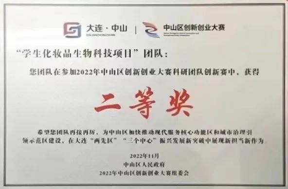 大连连璟生物科技有限公司,由生命科学学院2020级制药工程专业四名同学在2022年11月成立,选址于中山区天津街世贸大厦。创业宗旨是:以大学生为主要目标群体,进行化妆品的开发设计与采购销售,以学生自我个性设计与自主调配而形成最终产品;创业理念是:健康肌肤,活化心灵,创造美丽。该项目在2022年大连市中山区创新创业大赛荣获得二等奖。