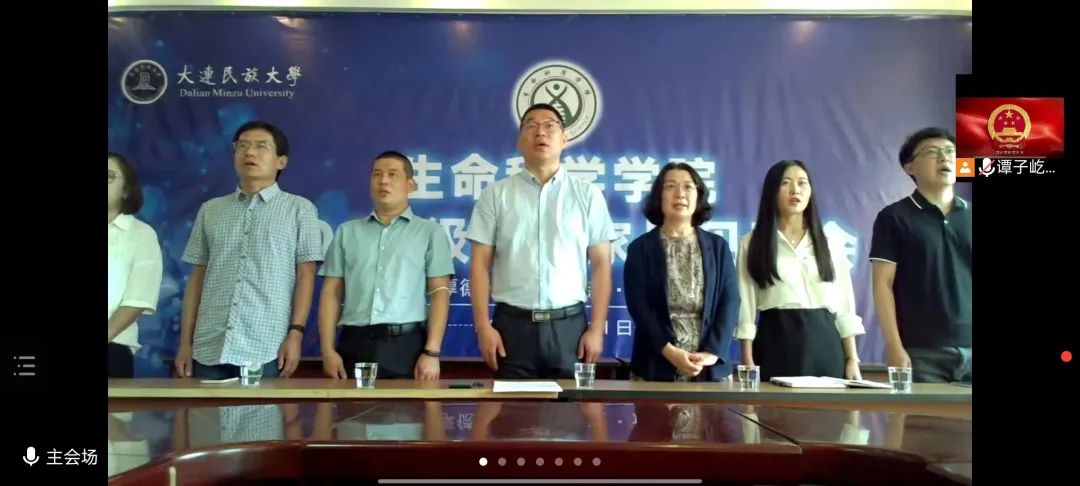 在激昂欢快的歌曲——《爱我中华》的暖场中,生命科学学院2022级新生家长线上见面会正式开始。与会全体教职工与家长、学生共同庄严肃立,齐唱国歌。