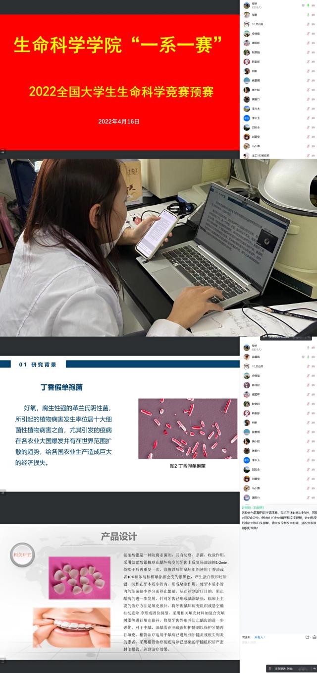 按照防疫防控要求,本次竞赛以线上答辩的形式进行,分为限时自述及评委提问两部分,各参赛队伍依次答辩,主要考察参赛选手科研能力、创新能力、解决实际问题的能力以及生命科学学科专业综合能力。