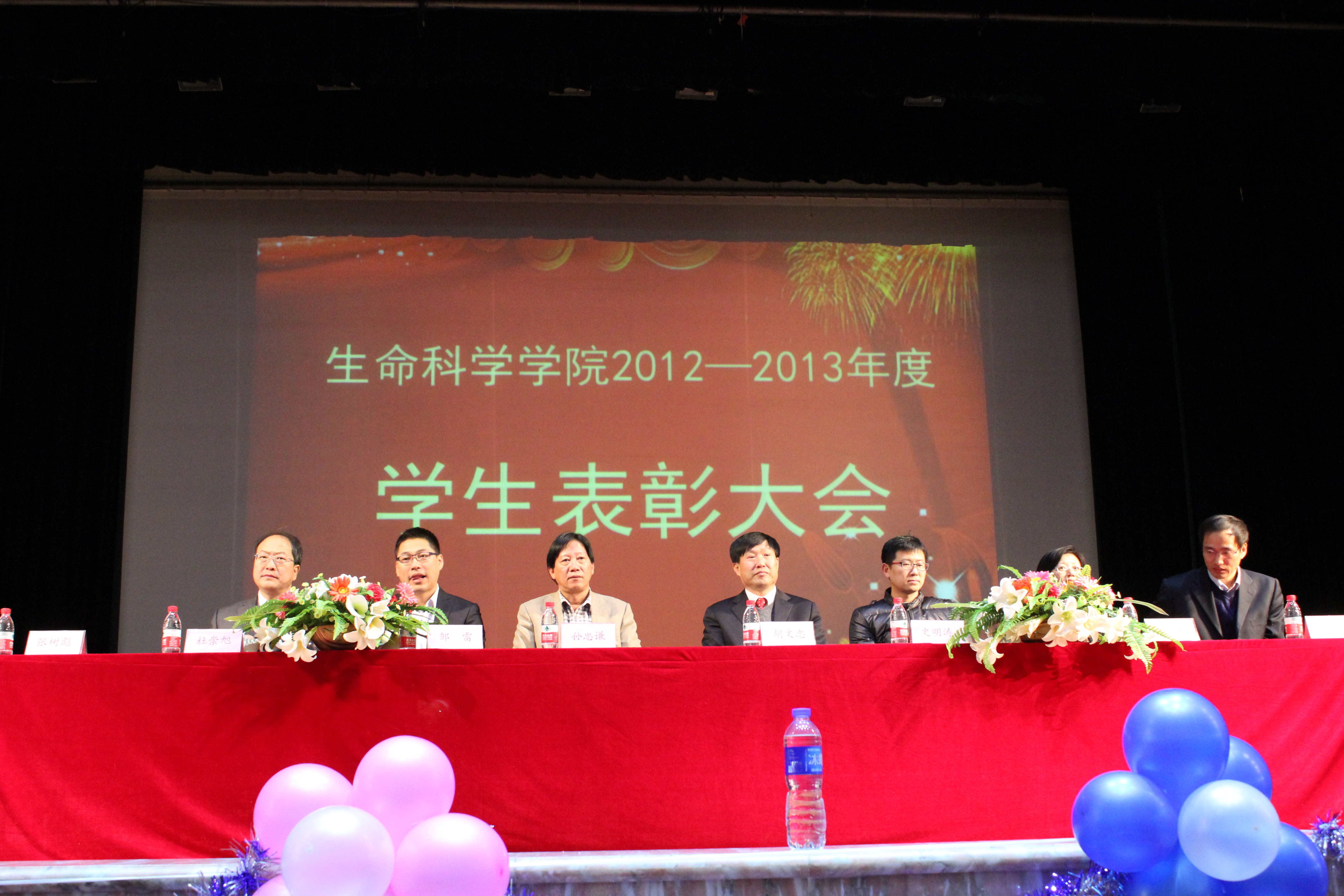 11月19日晚6点,太阳鸟报告厅内掌声阵阵,气氛热烈,生命科学学院2012-2013学年获奖学生、“金塔”奖学金表彰大会暨“梦想启航”师生联欢晚会隆重举行。校招生就业处处长孙忠谦、生命科学学院院长胡文忠、总支书记张树彪、校团委书记史明涛、党委学生工作部副部长邹雷、副院长刘秋、副院长杜崇旭、总支副书记仲天宝及学院各年级师生代表近千人出席大会。会议由生命科学学院党总支书记张树彪主持。