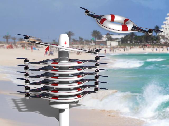 Coastal Rescue是一款专门为海边游玩提供安全保障的新型无人机装置系统,当有人落水时,启动此装置,启动充气泵,瞬间将救生圈充满气体。通过监测设备定位到求救者的位置,飞到落难者身边后,通过其自身滑轨结构,释放救生圈,将救生圈投放到落水者身边,给落水者提供及时的救助,极大的提高了救援的速度。