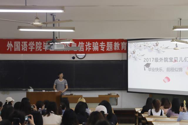 在防电信诈骗专题教育环节,开发区分局民警就近期发生的真实案例向毕业生介绍各种电信诈骗类型及防范策略。许海英副书记针对毕业生日常管理提出相关要求,号召毕业生文明离校、安全离校。最后辅导员针对就业政策、报道派遣、档案管理等与毕业生密切相关的事项进行详细解读,并对外国语学院2021年毕业季相关活动进行布置安排。