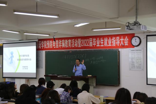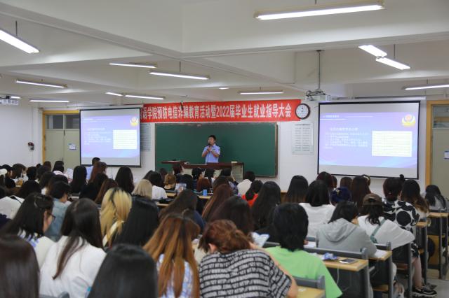 为提高学生防范电信诈骗意识,促进2022届毕业生顺利毕业就业,外国语学院于6月16日召开外国语学院预防电信诈骗教育活动暨2022届毕业生就业指导大会。大连市公安局开发区分局警官刘冬和张伟琛、滕泰科技大连有限公司于希江、学校招生就业处处长王喜春、研究生处霍苗、外国语学院党总支副书记许海英及外国语学院2018级全体同学参加了本次活动。
