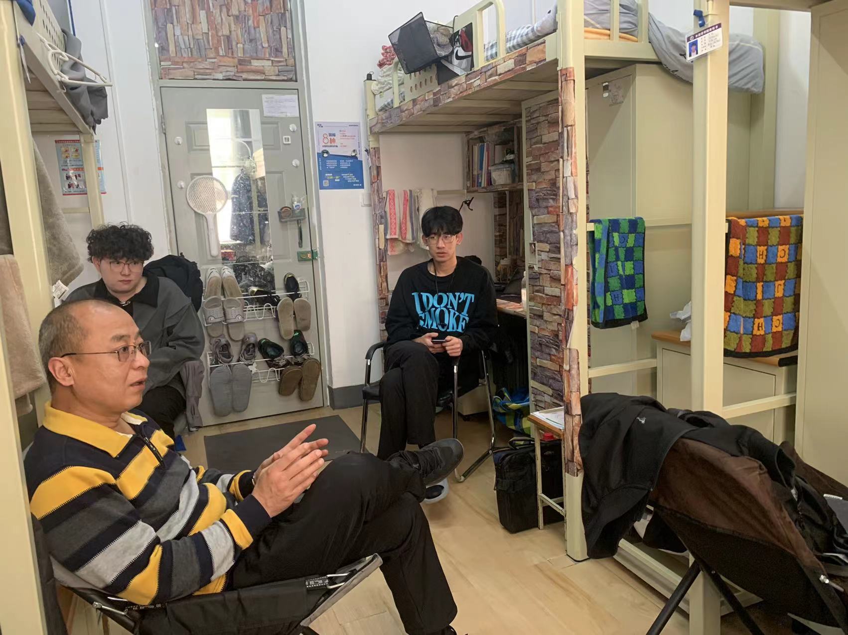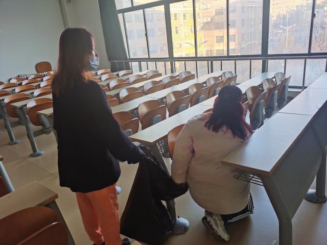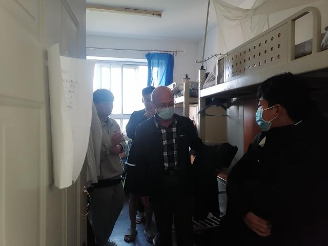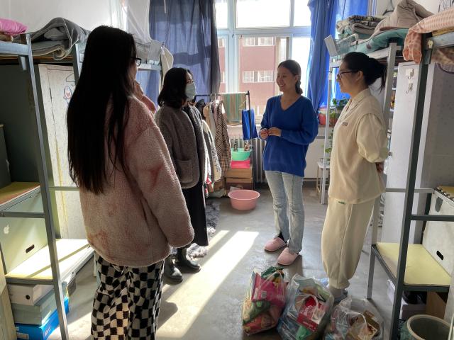 戮力同心,合力守护。疫情期间,各班组织学生对寝室卫生进行集中清扫、消毒、通风,真正落实秋冬交替季节的疫情防控。为了不让一个学生掉队、守护学生身心健康,外国语学院组织各年级辅导员老师、各专业教师、班导师驻校值班。日语系元明松老师、英语系王玉平老师、朝鲜语系文英熙老师深入学生寝室,感受学生真实的生活、学习环境,与同学们进行亲切交谈,一起探讨寝室学习的利弊,鼓励并带动学生走出去、动起来,开始了“每周锻炼打卡”活动,与学生相约一同进行体育锻炼,强化体魄。教师们进一步掌握学生在校情况,加强了师生之间的沟通交流。在确保教育教学平稳有序进行的同时,极大地增强了师生共同抗疫的信心。