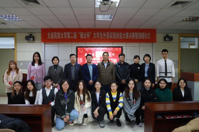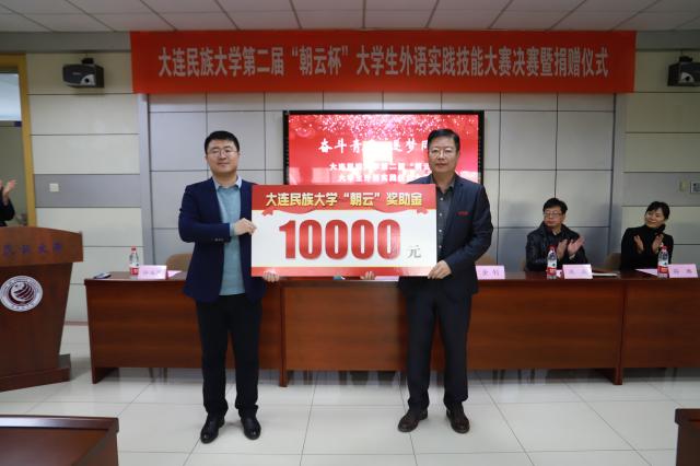 黄永东副校长为比赛致辞,感谢朝云科技有限公司对比赛的大力支持,感谢评审组的辛勤付出,希望师生们以比赛为契机,推进教育教学改革和创新,铸牢中华民族共同体意识,为打造“学在民大”的民大口碑共同奋斗。金钊总经理表示,外语实践技能大赛的举办不仅激发同学们勤奋学习,奋勇拼搏的精神,而且能使同学们在团队协作中收获友情,取长补短,希望同学们在压力与挑战中积累知识和经验,将来积极投身于国家建设和社会服务中去。最后,张志刚院长代表学院接受朝云科技有限公司捐赠。
