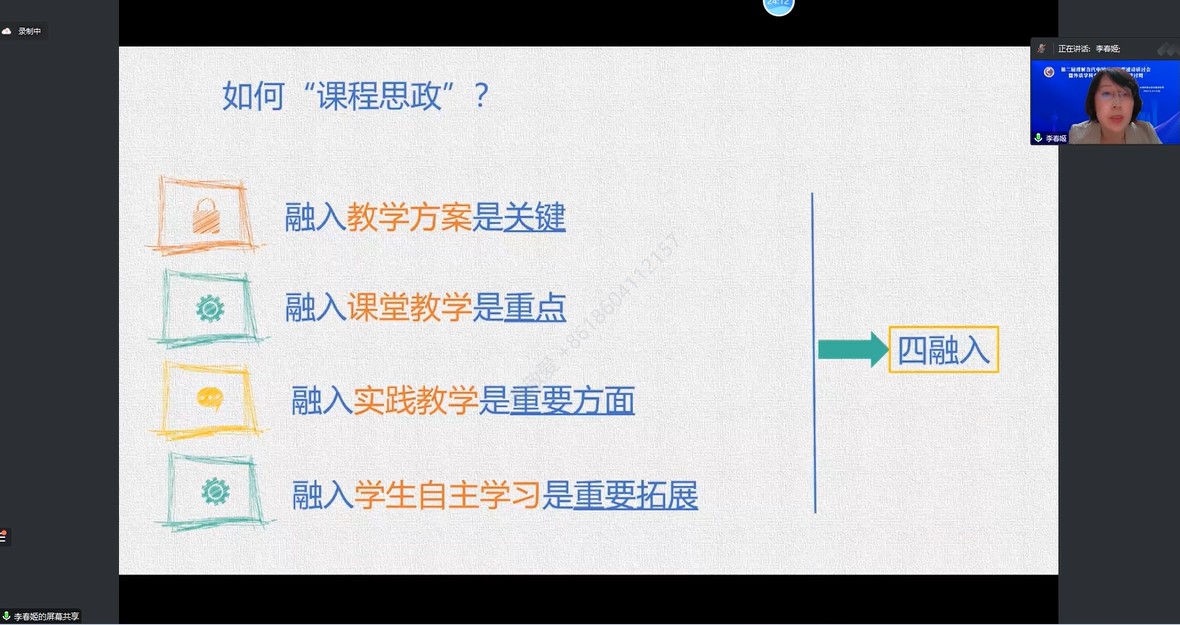 李春姬教授的分享对外语专业围绕落实立德树人根本任务,结合课程思政教育理念,积极探索如何将习近平新时代中国特色社会主义思想有效融入课堂教学中,引导学生独立思考、自主学习,将厚植家国情怀、开阔国际视野与提高专业本领同向同行,努力实现立德树人的教学目标方面提供了可借鉴的方法论和实践经验。