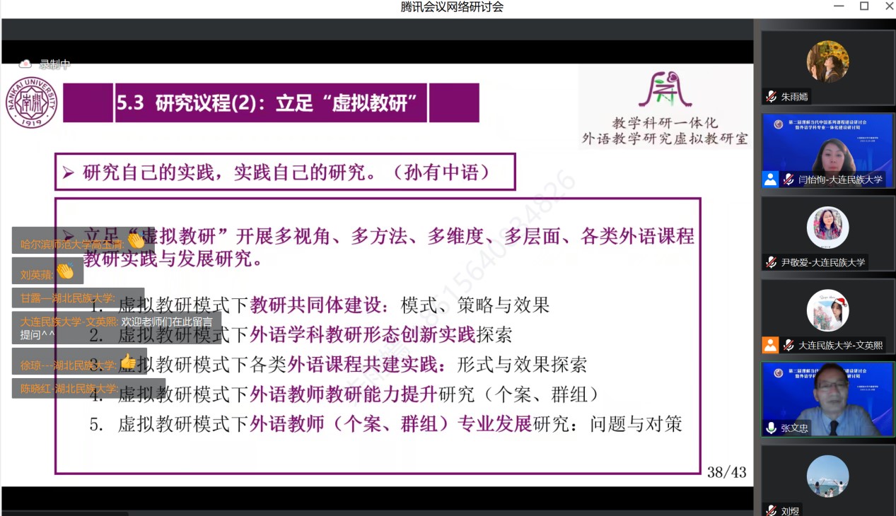 本次会议与会者100余人,张文忠教授发言后,来自东北三省一区东北师范大学、哈尔滨师范大学、大连外国语大学、内蒙古民族大学、渤海大学、湖北民族大学、沈阳师范大学、沈阳药科大学、欧冠官方网站、鞍山师范学院等十多个院校的专家、教授、老师们,对外语学科专业建设、国际传播能力建设、理解当代中国系列课程与教材建设等进行了充分的交流与讨论。闫怡恂教授代表参会教师对报告内容进行提问,张文忠教授在回答提问过程中,进一步对虚拟教研室项目的申报准备进行解释。张文忠教授提到,各个省份高校可以从校级开始自我建设,联合全国高校教师,形成规模,为省级教研室申报做好准备。例如湖北师范大学的成功。