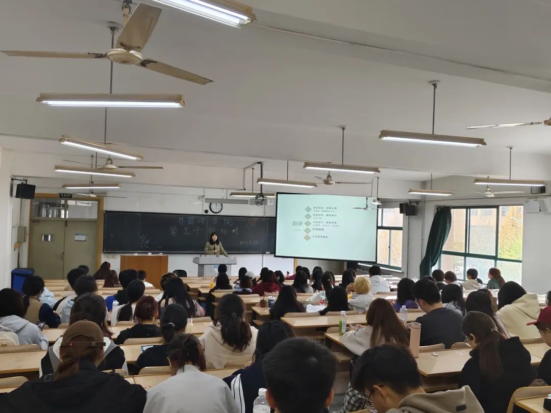 为深入学习宣传贯彻党的二十大精神,进一步落实立德树人根本目标,加强学生干部队伍建设,培养学生干部责任与担当意识,提高学生干部工作技能,把学校党委提出的“抓基层、抓落实、抓学风”工作总要求落到实处,2023年10月23日中午12:00,外国语学院于融汇楼201召开学生干部培训会,学院2023级全体学生干部参加本次培训,培训由学院学工办主任李响老师主讲。