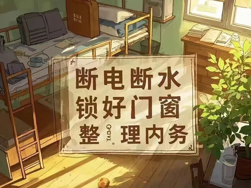 01离校前,请大家对宿舍进行全面安全检查。离开宿舍时确保所有用电器关闭,拔掉插排上所有充电线等,确保人走电断,避免存在火灾等安全隐患。