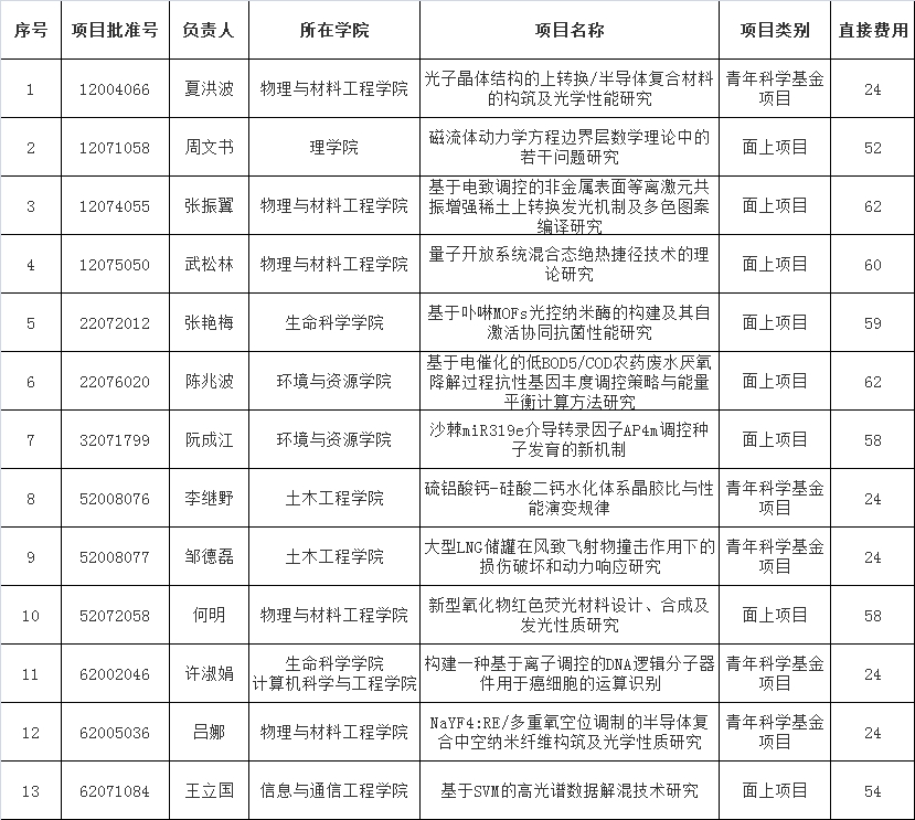 国家自然科学基金项目面向基础研究和应用基础研究,是重要的国家级科研项目,是学校培养科技骨干人才、培育优秀科研团队的重要依托。各项目负责人表示,将按照项目任务书要求,认真筹备项目实施,扎实开展研究工作,争取多出高水平科研成果,为推进学校科学研究和学科建设贡献力量。
