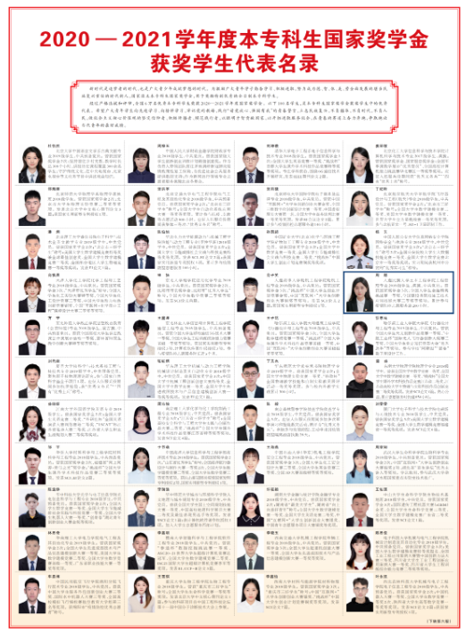 经过严格选拔和评审,全国6万名优秀本专科学生荣获2020—2021学年度国家奖学金。以下100名学生,是本专科生国家奖学金获奖学生中的优秀代表。希望广大青年学生向先进学习、向榜样学习,牢记党的教诲,践行“请党放心、强国有我”的青春誓言,立志民族复兴,不负韶华,不负时代,不负人民,做社会主义核心价值观的坚定信仰者、积极传播者、模范践行者,以聪明才智贡献国家,以开拓进取服务社会,在青春的赛道上奋力奔跑,争取跑出当代青年的最好成绩。
